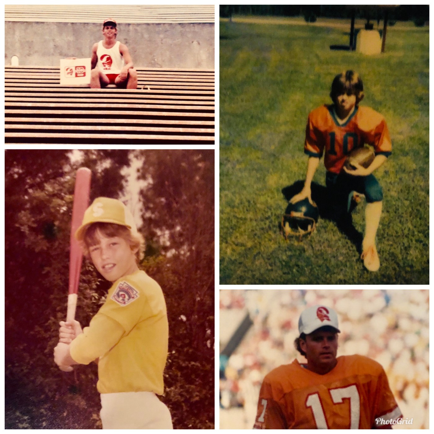 *Blog Photo including the 70s and 80s hair – baseball and football photos when I was 11 years old, sitting in old Tampa Stadium at age 18, and DeBerg sporting some 80s hair coming out of the ball cap.