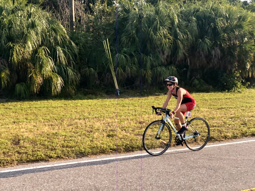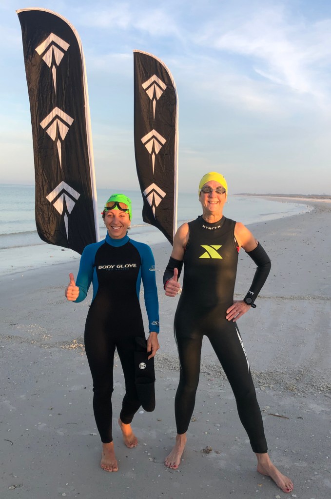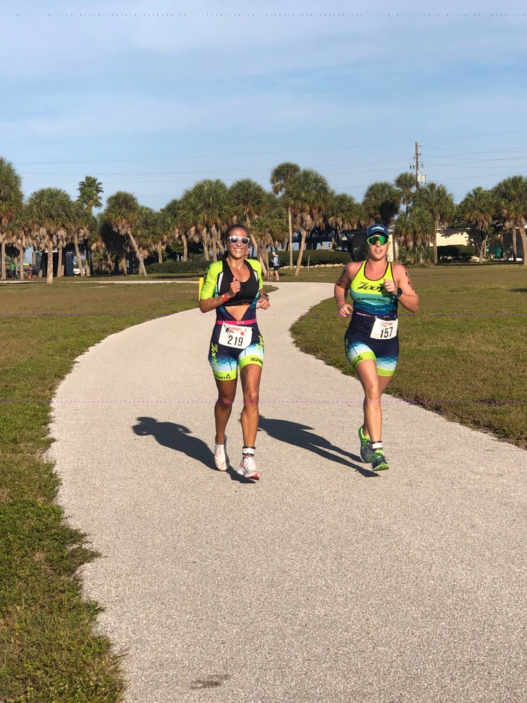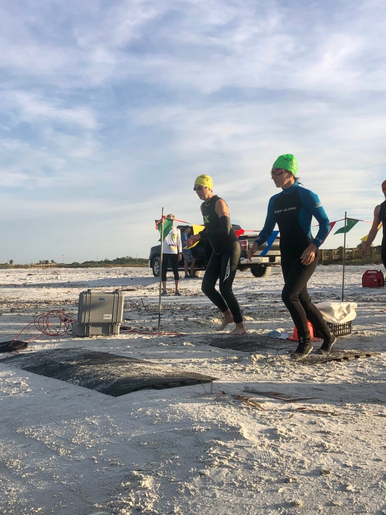 With a seasoned group racing in the duathlon I started the race with the triathletes. We ventured to the start where our team completed a brief warm-up swim. The water temperature was 63 degrees but thankfully the air temperature was just above that so it felt much better than a week prior at Challenge Daytona when the air temperature was 52 degrees at race start. Regardless, the water was cold so it was important for Lauren and Gail to get the feel of that again before race start. They both practiced cold weather swims including the days leading up to race so they knew the discomfort they would face. It was relieving to see the two of them stand in the water waste deep chatting after completing their warm-ups. Teammates supporting each other… When they walked out of the water they seemed ready to tackle it.
