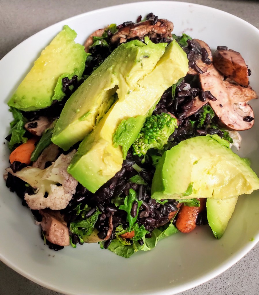 Rice bowl with arugula, roasted veggies and avocado
