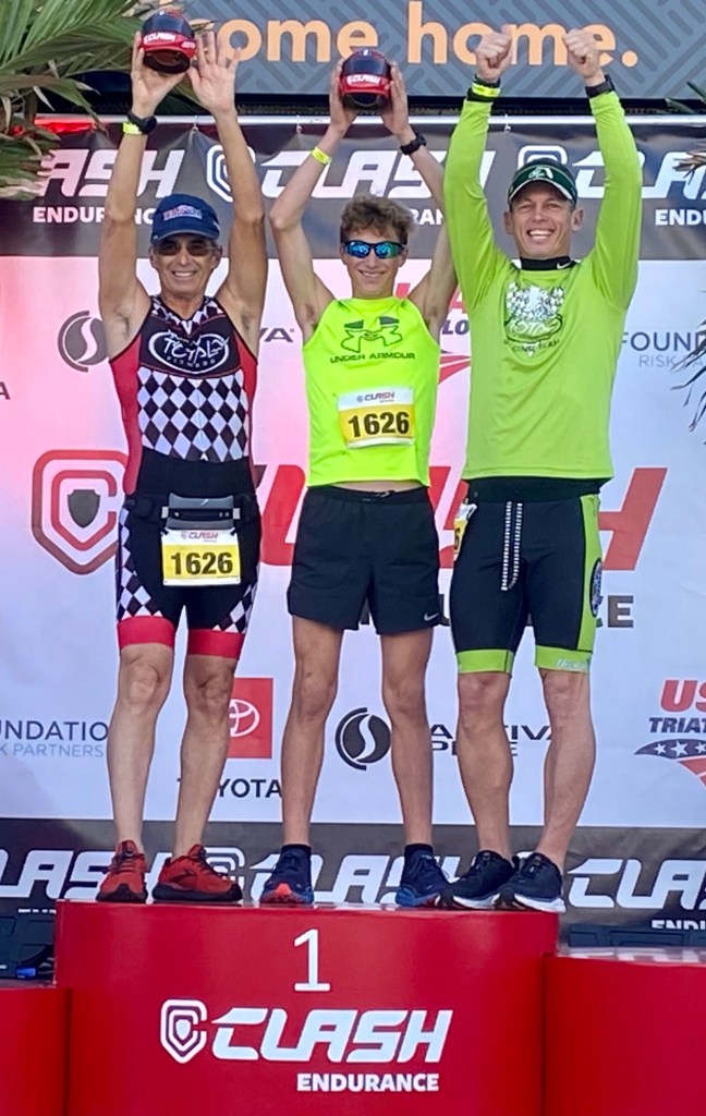 I was very happy with the splits (lap times) I was hitting and came in strong through transition. I racked my bike and stuck my leg out for Dylan to grab the timing strap and off he raced out for the final 3.1 mile run effort. Captain and I gathered our thoughts and began our jog to the finish line as we knew Dylan was going to run fast. He did just that as before we knew it he was racing in with a 16:03 5k time vaulting us to the Overall Relay win!