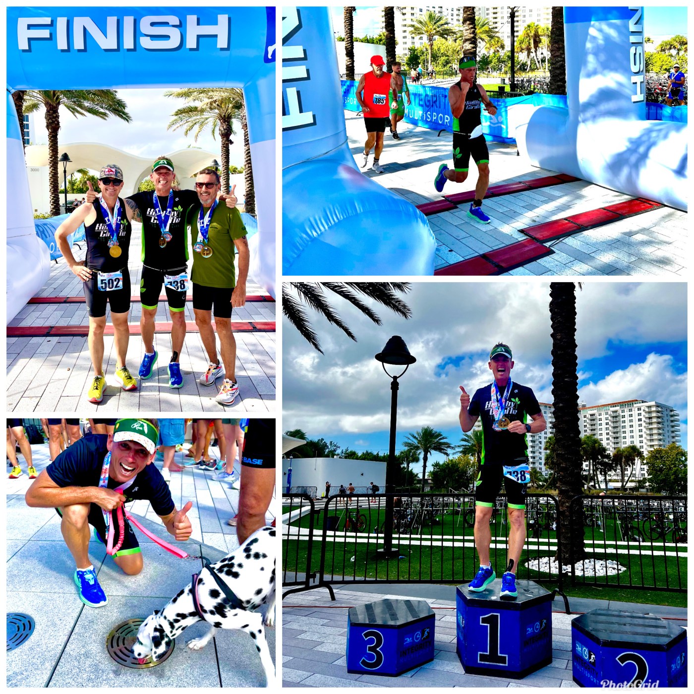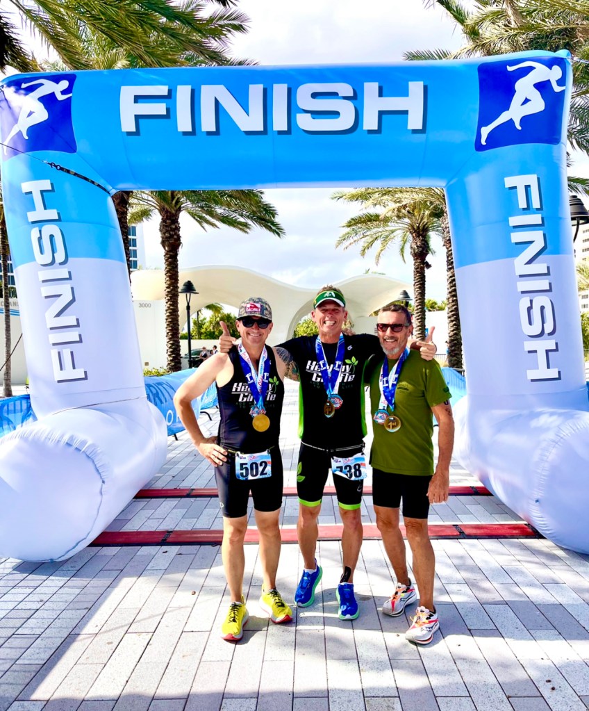 Mark, who had finished earlier completing the Sprint race cheered me on through the Finish Line. We gathered chatting about our races and then Bob came through. Boy, did the Pinellas County Giraffes come through… Mark finished 4th Overall and won Masters (fastest over 40 years old) in the Sprint, Bob placed 2nd Overall in the Olympic, also winning Masters, and I won Overall.
