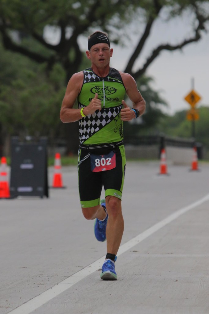 When I began to unclip out of my bike shoes before dismounting my right hamstring locked up (you can see in a picture below), charley-horsing but I quickly got my act together and hobbled through transition to get my run shoes. The hobble turned into my normal stride as I exited transition but at mile one I began to feel the hamstring flutter and at about 1.25 miles it locked up again stopping me in my tracks. I quickly stretched my leg out straight and punched the hamstring a few times to get the muscle to release. It unlocked and I hobbled away for the next 100 yards or so before I settled into a stride I changed in hopes it wouldn’t go again. I held that stride for the final stretch with the 7th best run and holding on to 5th place by 17 seconds.