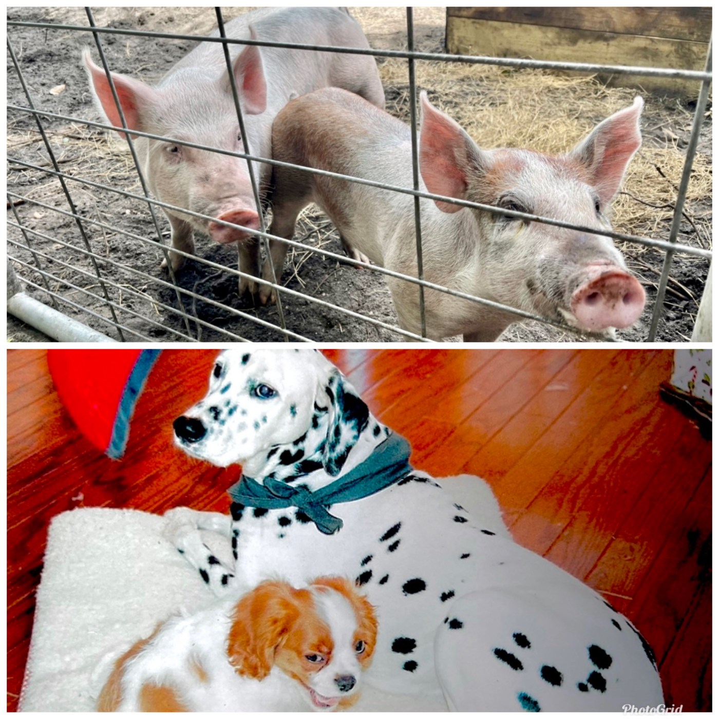 Featured Blog Photo – These are the lucky pigs, Oni and Samsara, saved from horror at Shelter Farm Sanctuary by founder and owner, Jenni Presley. Below them are my dogs who have passed along years ago but are still in my heart, Domino and Bailey. I think we should treat all animals with love and care and who would think that Oni and Samsara are smarter than my two precious hounds.