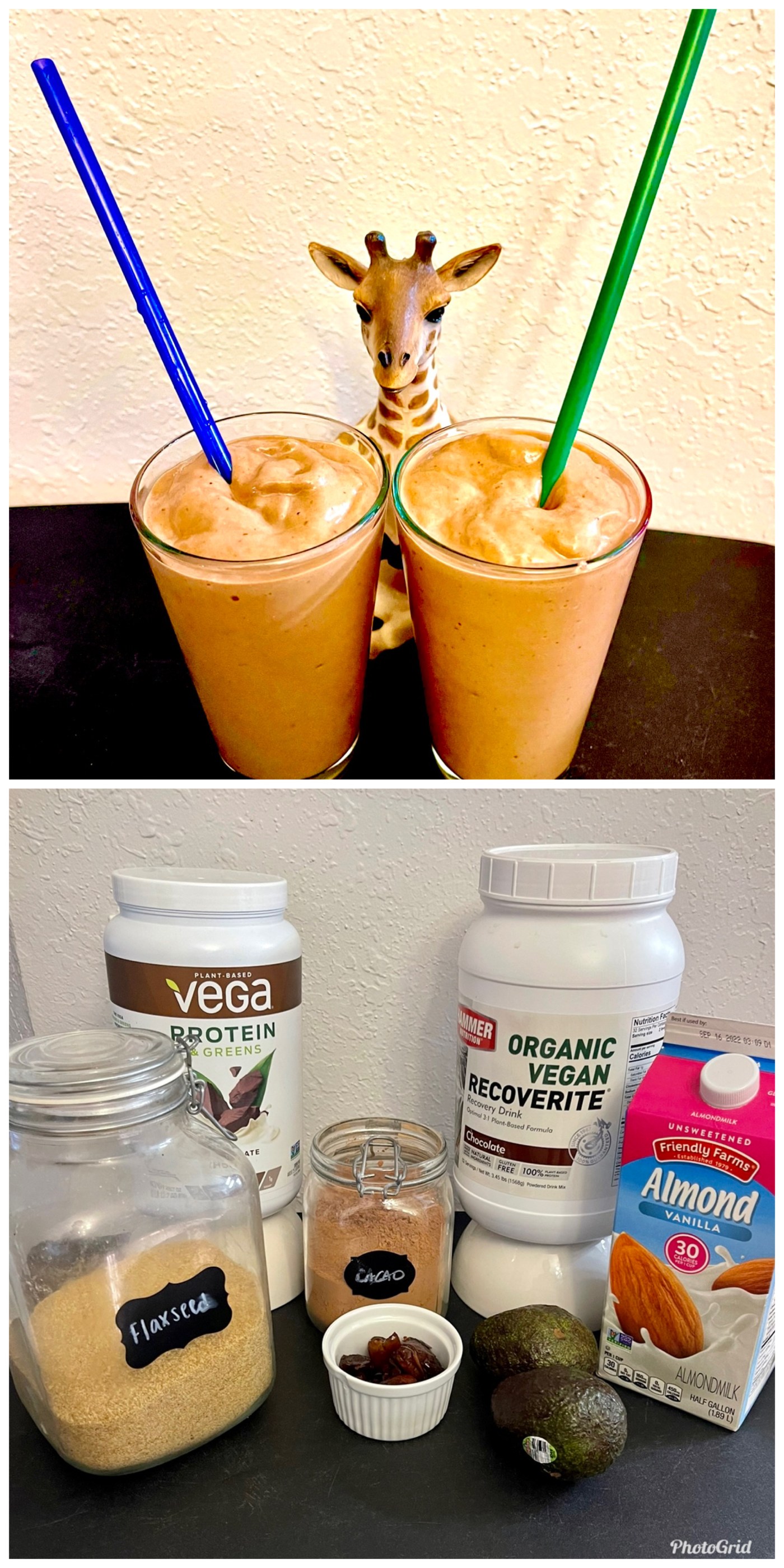 Starting with dates, the perfect super food provides the natural sweet with fiber. The avocado provides the rich smooth texture while I throw in one of Dr. Michael Greger’s Daily Dozen, flaxseed, to give you the heart healthy boost of omega-3s! If you know me well, you know I love chocolate and this comes the way of cacao and your choice of either Vega Protein & Greens or Hammer Nutrition Organic Vegan Recoverite. Cacao is great for our heart and brain power as well. Throw in your favorite plant-based milk and you have quite the healthy treat. If you are looking for a bit more protein, find a drink mix to suit your needs or if you are looking for more carbs as I do to fuel recovery after a tough workout, find a more carb loaded drink mix. The two I listed here are my favorites.