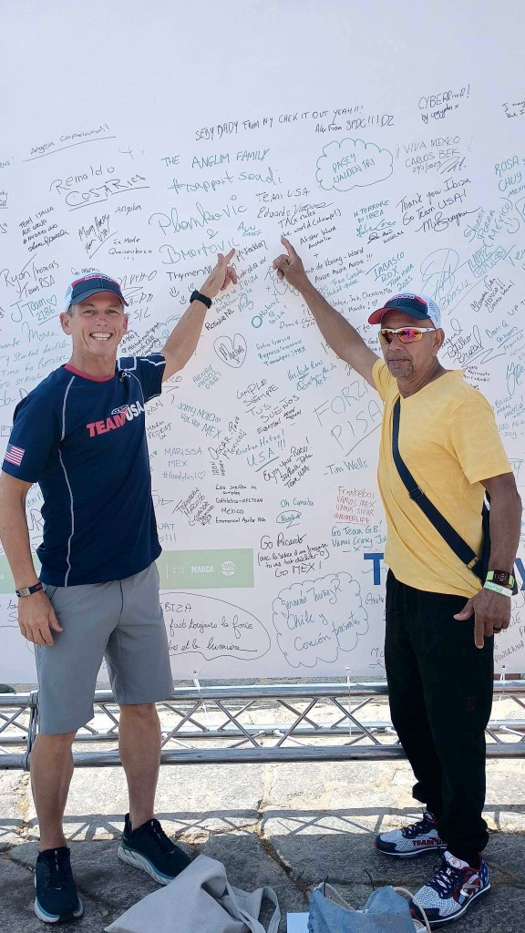 Friday was a busy day. I met fellow Team USA athletes at 7:00 AM for a run on the event run course. This was the most complex path of a run course I’d ever seen and could not make sense of it on maps and a virtual demo, so this was a much-needed mission. After the run I grabbed breakfast in the hotel and headed to packet pick up on the other end of the island. I did not rent a car but a great friend and teammate from Florida, Ed Vasquez, did and he took us there. In addition to picking up our race packet, we strolled through the Expo and took a few pictures. We headed back to the hotel where we got ready for the opening ceremonies including the Parade of Nations. This was a great experience where all countries and athletes met in the village and walked through the vivacious streets full of spectators. Here I also caught up with a great competitor in my age group, Mark Witmer, where we shared several stories along the parade route.