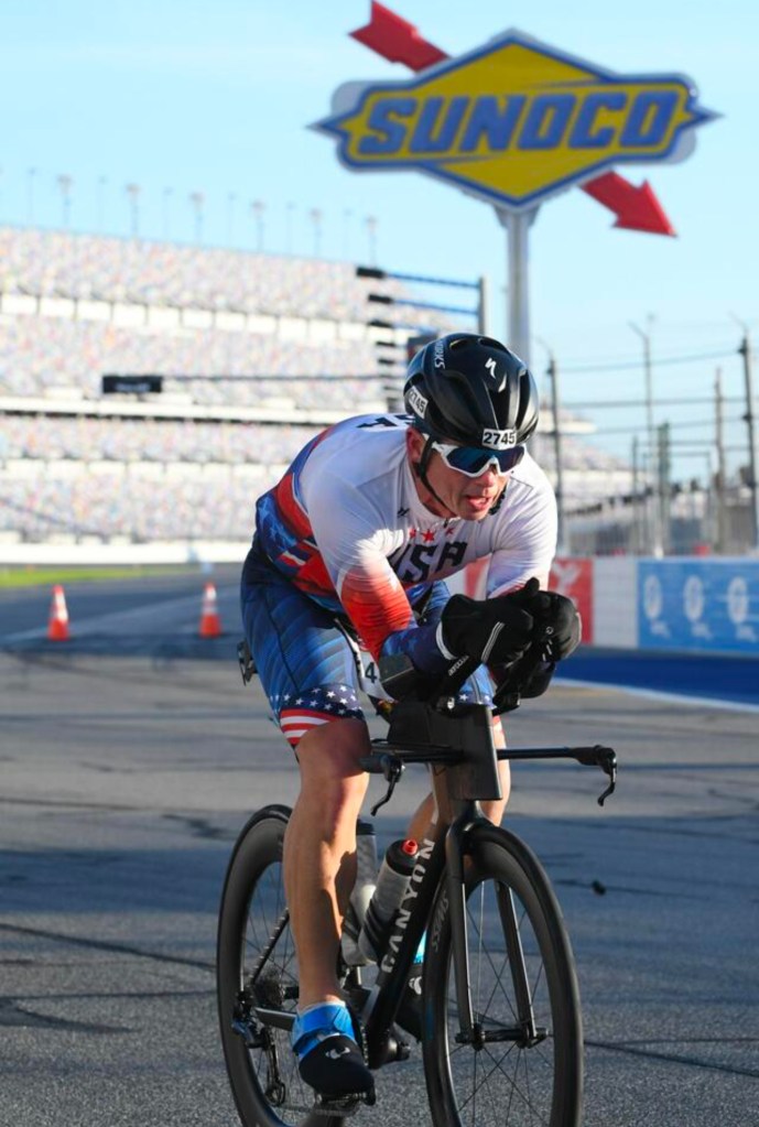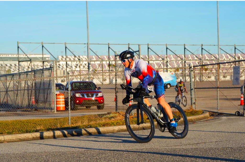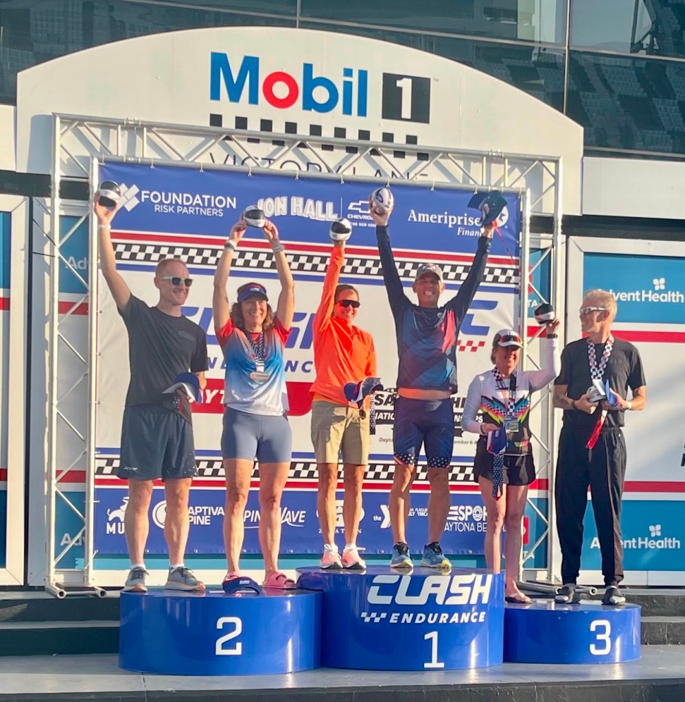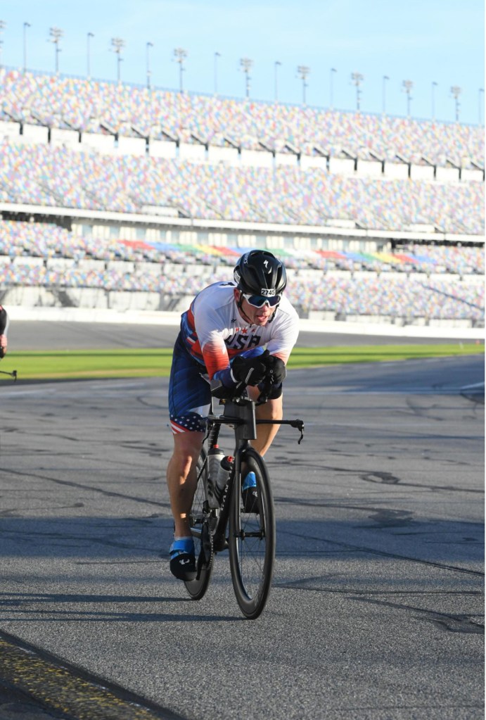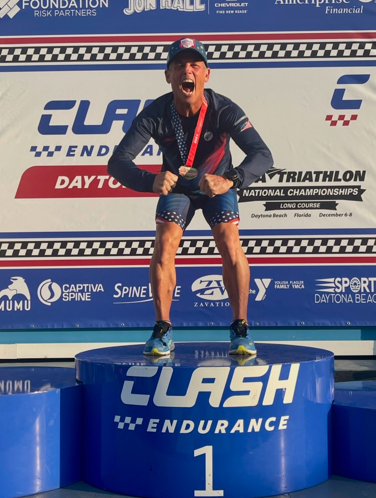 I won my first National Championship! Last Sunday I participated in the USA Triathlon Long Course National Championships at the Daytona International Speedway competing in the Duathlon consisting of a 5k run – 56-mile bike – 13.1 mile (1/2 marathon) run. This was my third time competing at this distance in a National Championship and after two – 2nd place finishes, I earned my first Gold Medal on this day (in any distance). It was an emotional finish attaining a goal that could never come…
