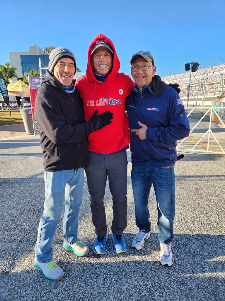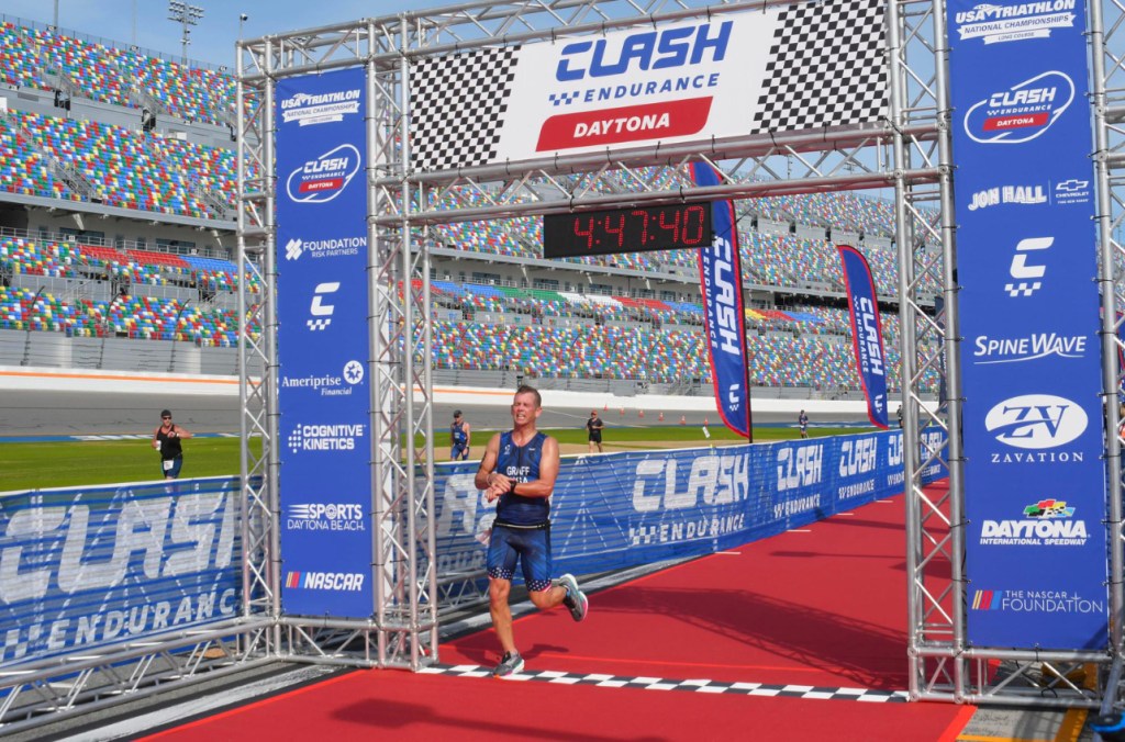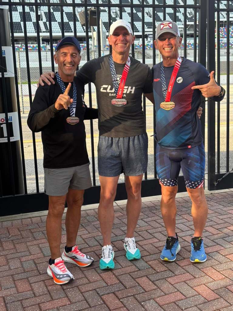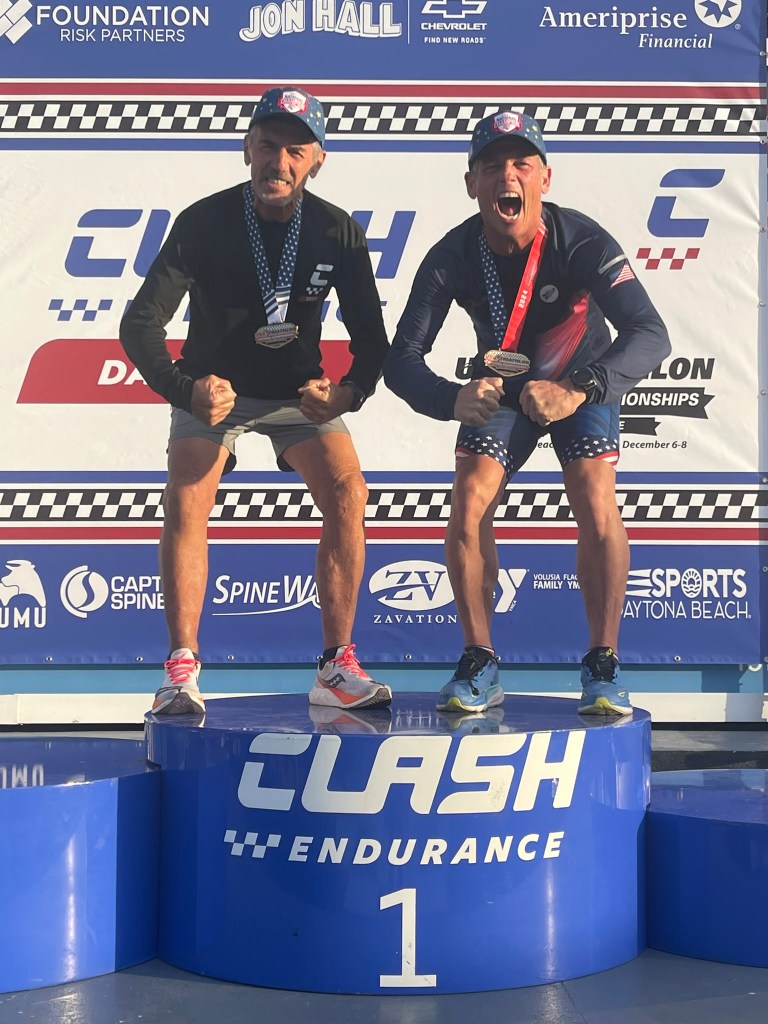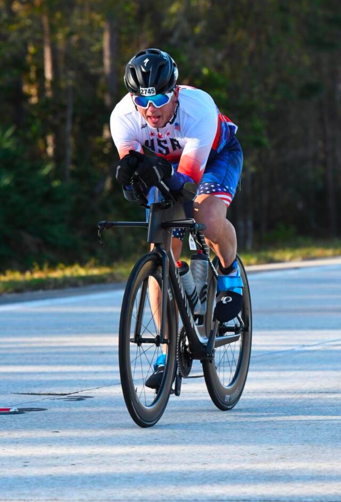 I won my first National Championship! Last Sunday I participated in the USA Triathlon Long Course National Championships at the Daytona International Speedway competing in the Duathlon consisting of a 5k run – 56-mile bike – 13.1 mile (1/2 marathon) run. This was my third time competing at this distance in a National Championship and after two – 2nd place finishes, I earned my first Gold Medal on this day (in any distance). It was an emotional finish attaining a goal that could never come…