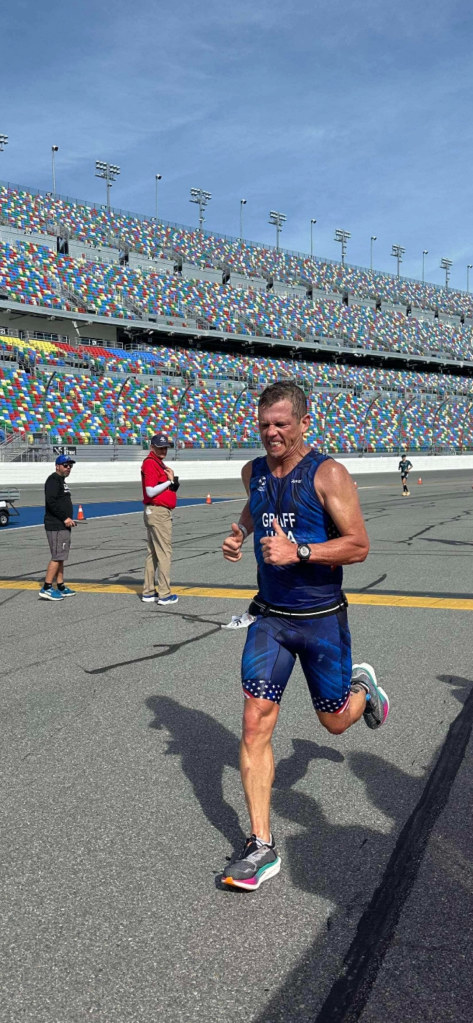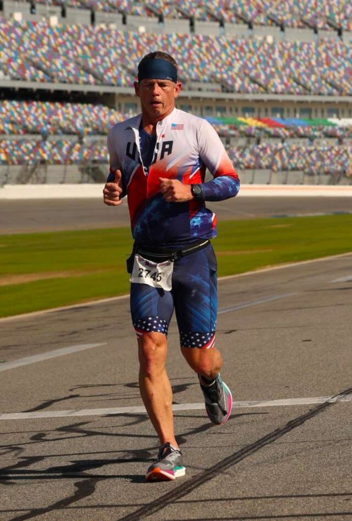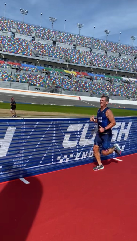 I knew I would have to be fast in transition consuming nutrition and hydration I had laid out ready to grab. The three of us were right next to each other so we knew the circumstance. I dashed out first and as soon as I got out of transition, I realized I didn’t take my cycling jersey off along with the gloves I stashed in my pockets near the end of the ride. I knew I couldn’t wear the jersey and carry the gloves the entire run, so I ditched the gloves in the trash at the first aid station. At that time Felim passed me like I was standing still. As we made our way around the apron of the track in turn one, he was distancing himself from me significantly.