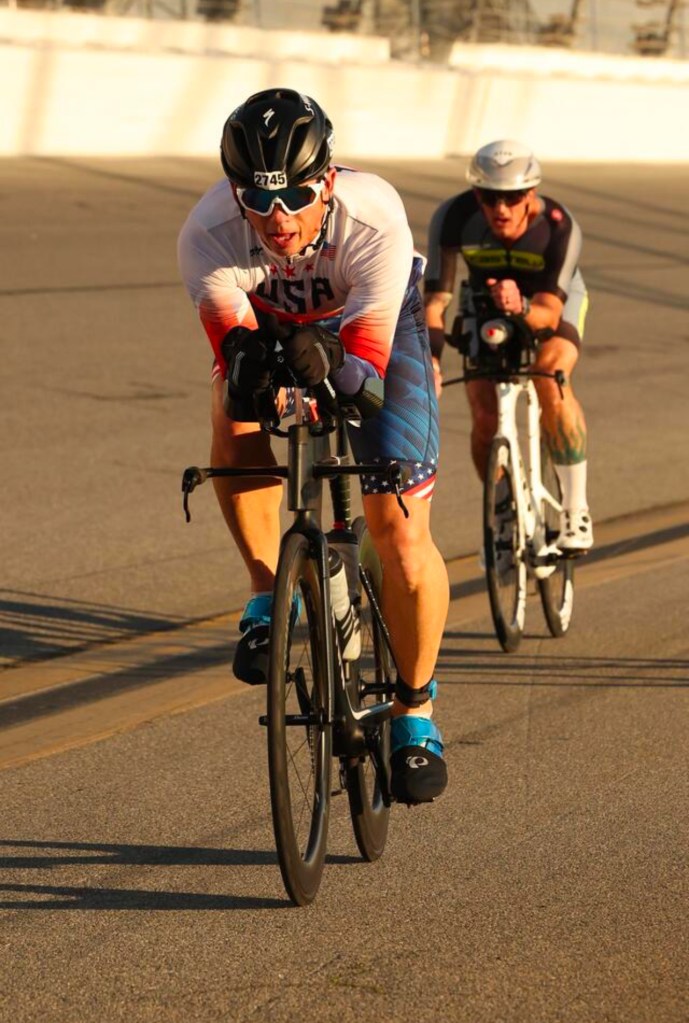 On race morning I took on my pre-race nutrition and completed my warm-up on a cold morning inside the track. It was in the upper 40s so I was all geared up with warm clothing. I had a decent warm up. My legs felt strong but not really fresh. For this distance I was ok with that as it was going to be a long grind. The temperatures were close to 50 at start, then in the 50s during the ride and 60s for the final run. With that in mind, my plan was to wear a tank top kit under a long cycling jersey, tri-shorts, and gloves for the first run and ride. At the second transition my plan would then be to shed the long sleeve jersey and gloves heading into the final run. Oh boy did that go wrong…blunder coming…
