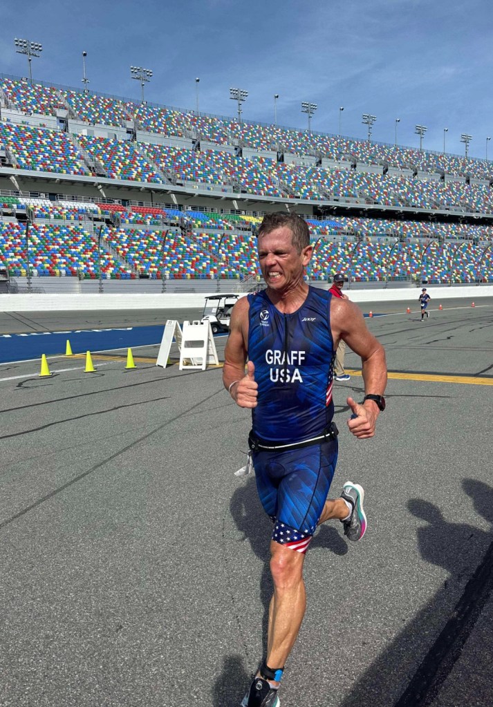 The run course consisted of three laps on the speedway track along with a brief insert to the infield at the beginning of each lap along with going under the grandstands for a mile at the end of each lap. As I got to the back stretch of the track in lap one, I lost sight of Felim. That was disheartening as what seemed to be my chance at a National Title fading away. I told myself to keep doing my thing by sticking to my game plan as I was running a very good pace at that point and could not jeopardize blowing up later in the run. I just had to do my plan, fight, and see what transpired.