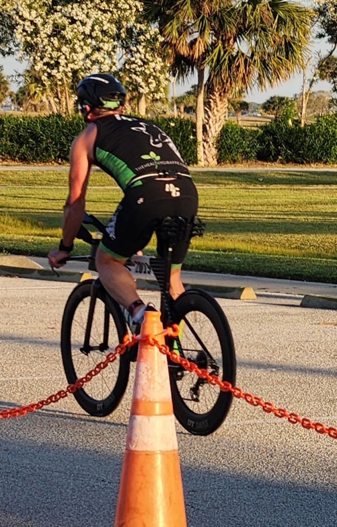 The horn went off and we vaulted out for the race that consisted of a – 1 Mile Run #1 – 12 Mile Bike – 5k Run #2. Both runs were on a golf course. The first run had two hard turns and one U-turn on what was a pretty flat hard surface. As I went out, I felt that freshness pop in my legs which was exciting. I charged in right behind the competitor who was 2nd while great buddy, Alvaro Coutinho, was way out ahead. What was more important is I ran 13 seconds faster than two weeks ago in Miami while laboring to attain that pace, I worked in this race but felt pretty darn good on this one.