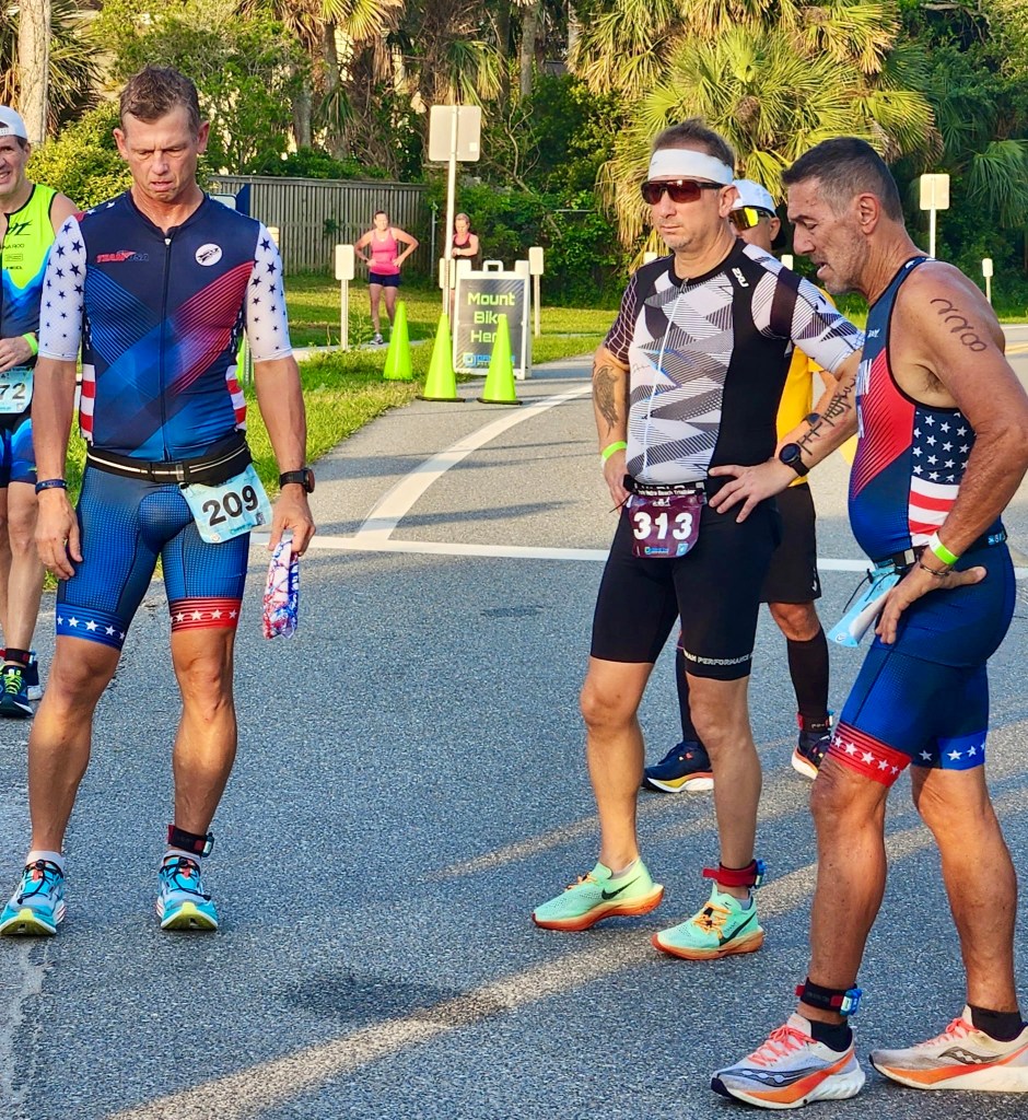 As I racked my bike in transition, I saw Jon’s bike was not there which meant something happened to him on the course. That was confirmed shortly after that he had a flat. That sucks! Out on the run I went and for the first quarter mile I was battling significant soreness under the sit bones to the hamstring. I had inched up on the bike seat several times to generate more power and that is the result on many previous occasions. I knew it would dissipate at some point, and it did as I eased into a comfortable stride.