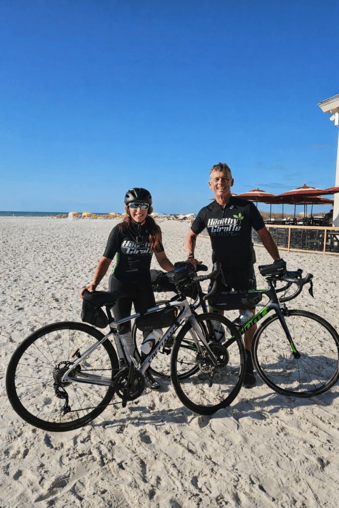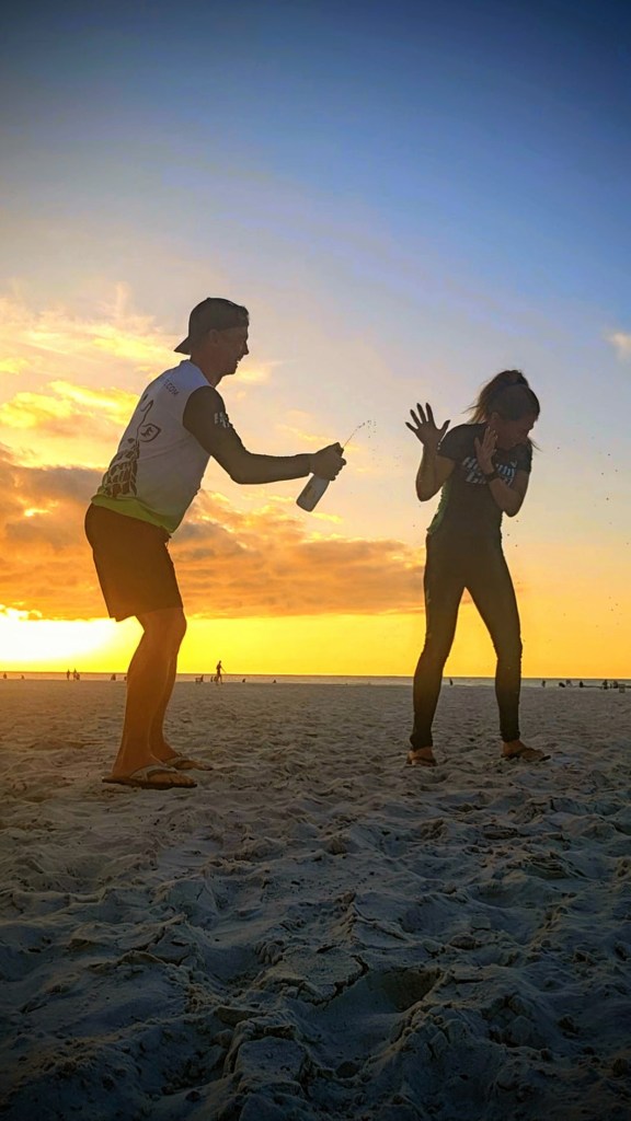 We finished dinner, walked out to the sand, and popped a bottle of champagne that I sprayed on Lauren and we both took a celebration sip. Over 221 miles and 21.25 hours from start to stop on the bikes in two days. That is an accomplishment and what is even more amazing is Lauren had zero bike legs in her to start. She hand’t been on a road or triathlon bike the entire year of 2025. We have horsed around on our hybrid bikes around town but that’s it. I never doubted her…I know her. Her experience from training and competing in ultra marathons and marathons on top of her determination got her to do this.