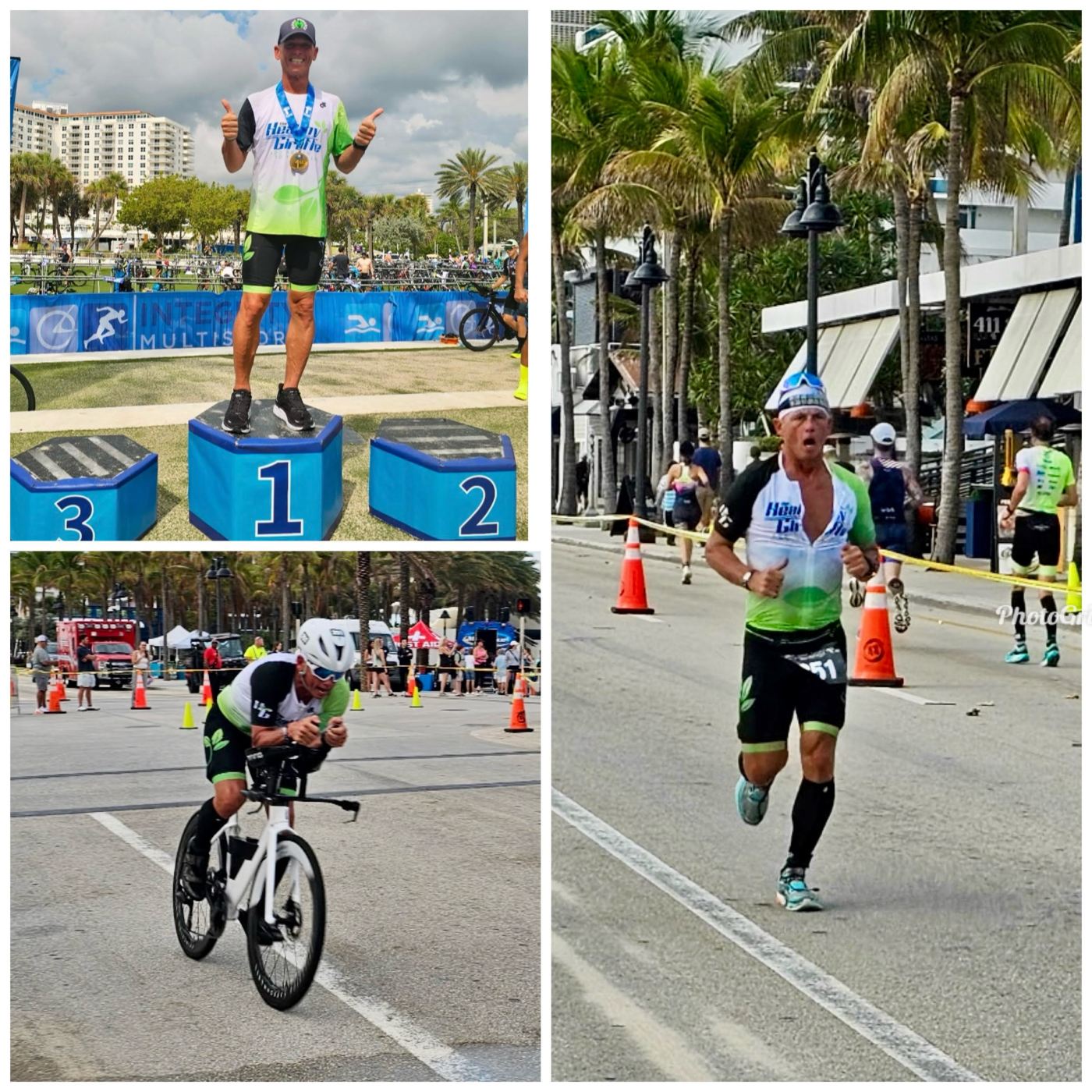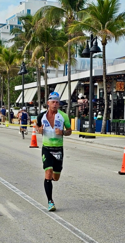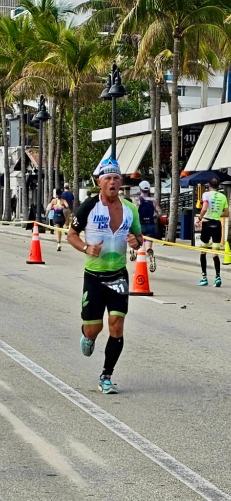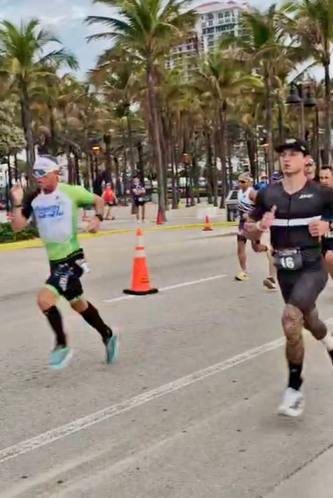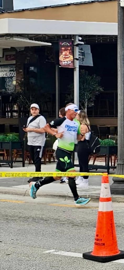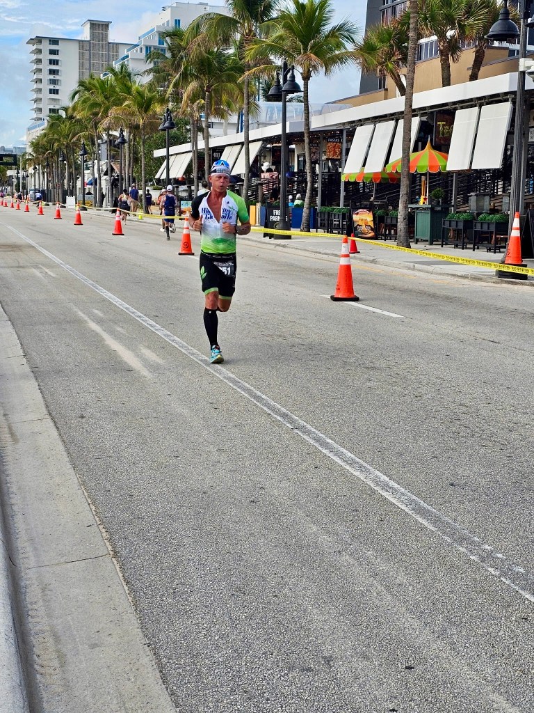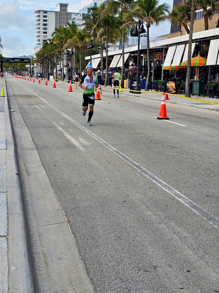 I finished the bike strong and headed out in the lead for the 10k run. I was not sure what my lead was but I was feeling good and my pace started out ahead of my goal pace. It was warming and I continued to take my nutrition on the run…cramps are always lingering around the corner for me…but I felt in control. This course had a half mile path south before u-turning heading north for 2.5 miles out and back up Atlantic Boulevard as well.